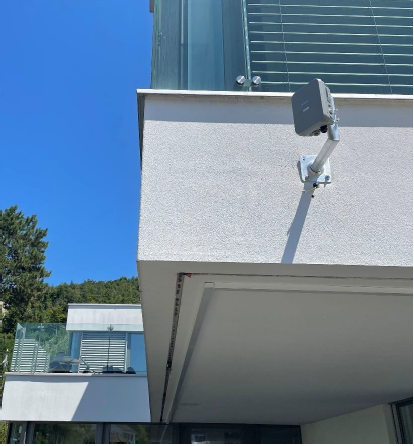 Na slici je prikazana instalacija vanjske Wi-Fi antene, idealna za proširenje bežičnog internetskog signala na otvorenom prostoru – kao što su terasa, dvorište, parkiralište ili drugi objekti u blizini.